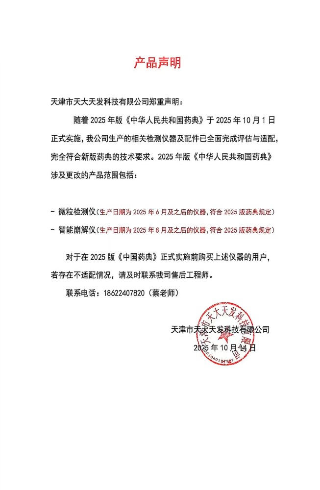 聲 明鑒于2025版《中國藥典》的更新,為保障天大天發(fā)忠實(shí)用戶的切身利益,凡在2025年之前購置我公司設(shè)備的客戶,若您的設(shè)備未能滿足新版藥典的要求,我們將提供升級(jí)服務(wù)。涉及產(chǎn)品:微粒檢測儀:GWJ-1···...